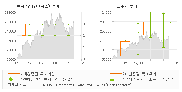 오늘 대신증권에서 발표된 '매수(유지)'의견 및 목표주가 285,000원은 전체 컨센서스 대비해서 대체적으로 평균치에 해당하는 수준으로, 이번 의견은 동종목에 대한 전체적인 흐름에서 크게 벗어나지 않은 것으로 파악되며 목표가평균 대비 2.5% 초과하고 있는 것으로 집계되었다. 참고로 최근에 목표주가를 가장 공격적으로 제시한 IBK투자증권에서 투자의견 '매수(유지)'에 목표주가 320,000원을 제일 보수적인 의견을 제시한 SK증권에서 투자의견 '중립(유지)'에 목표주가 195,000원을 제시한 바 있다.