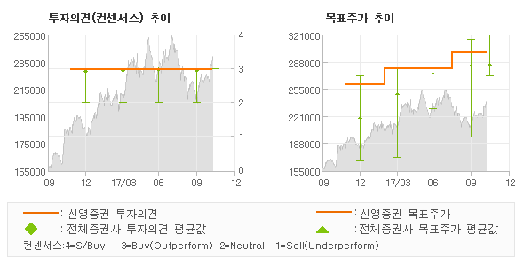 오늘 신영증권에서 발표된 '매수(유지)'의견 및 목표주가 300,000원은 전체 컨센서스 대비해서 대체적으로 평균치에 해당하는 수준으로, 이번 의견은 동종목에 대한 전체적인 흐름에서 크게 벗어나지 않은 것으로 파악되며 목표가평균 대비 7.9% 초과하고 있는 것으로 집계되었다. 참고로 최근에 목표주가를 가장 공격적으로 제시한 IBK투자증권에서 투자의견 '매수(유지)'에 목표주가 320,000원을 제일 보수적인 의견을 제시한 SK증권에서 투자의견 '중립(유지)'에 목표주가 195,000원을 제시한 바 있다.