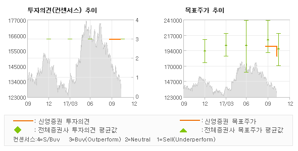 오늘 신영증권에서 발표된 '매수(유지)'의견 및 목표주가 185,000원은 전체의견에 수렴하면서 시장의 평균적인 기대감이 비교적 객관적으로 표현된 것으로 풀이되며 목표가평균 대비 7.2%정도 미달하고 있는 것으로 집계되었다. 참고로 최근에 목표주가를 가장 공격적으로 제시한 하이투자증권에서 투자의견 '매수(유지)'에 목표주가 230,000원을 제일 보수적인 의견을 제시한 하나금융투자에서 투자의견 '매수'에 목표주가 170,000원을 제시한 바 있다.