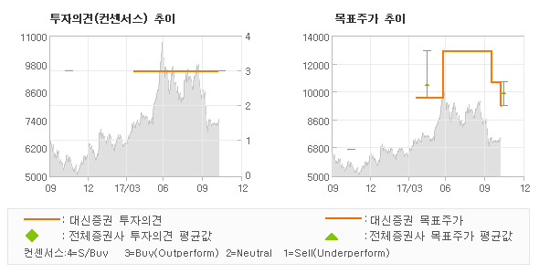 오늘 대신증권에서 발표된 '매수(유지)'의견 및 목표주가 9,500원은 전체 컨센서스 대비해서 대체적으로 평균치에 해당하는 수준으로, 이번 의견은 동종목에 대한 전체적인 흐름에서 크게 벗어나지 않은 것으로 파악되며 목표가평균과 대비해서 미미한 차이가 나는 것으로 집계되었다. 참고로 최근 증권사 매매의견 중에서 제시한 바 있다.