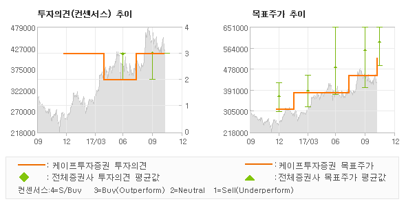 오늘 케이프투자증권에서 발표된 '매수(유지)'의견 및 목표주가 520,000원은 전체 컨센서스 대비해서 대체적으로 평균치에 해당하는 수준으로, 이번 의견은 동종목에 대한 전체적인 흐름에서 크게 벗어나지 않은 것으로 파악되며 목표가평균 대비 10.4%정도 미달하고 있는 것으로 집계되었다. 참고로 최근에 목표주가를 가장 공격적으로 제시한 유화증권에서 투자의견 '매수'에 목표주가 650,000원을 제일 보수적인 의견을 제시한 BNK투자증권에서 투자의견 '매수(유지)'에 목표주가 490,000원을 제시한 바 있다.