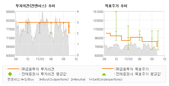 DB금융투자의 동종목에 대한 최근 1년동안의 투자의견은 전체적으로 조금 하향조정되고 있다. 목표주가는 2016년10월 105,000원까지 높아졌다가 2017년7월 88,000원을 최저점으로 목표가가 제시된 이후 최근에 77,000원으로 새롭게 조정되고 있다.