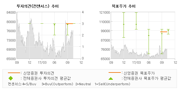 오늘 신영증권에서 발표된 '매수(유지)'의견 및 목표주가 97,000원은 전체 컨센서스 대비해서 대체적으로 평균치에 해당하는 수준으로, 이번 의견은 동종목에 대한 전체적인 흐름에서 크게 벗어나지 않은 것으로 파악되며 목표가평균과 대비해서 미미한 차이가 나는 것으로 집계되었다. 참고로 최근에 목표주가를 가장 공격적으로 제시한 메리츠종금증권에서 투자의견 '매수'에 목표주가 100,000원을 제일 보수적인 의견을 제시한 키움증권에서 투자의견 '매수(유지)'에 목표주가 94,000원을 제시한 바 있다.