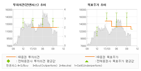 KB증권의 동종목에 대한 최근 9개월 동안의 투자의견은 전체적으로 큰 변화없이 유지되고 있다. 목표주가는 2017년3월 14,700원까지 높아졌다가 2017년5월 13,200원을 최저점으로 목표가가 제시된 이후 최근에 12,400원으로 새롭게 조정되고 있다.