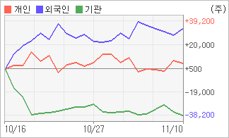 | 외국인/개인 순매수, 기관은 순매도(한달누적) 11월9일부터 전일까지 기관이 2거래일 연속 순매도를 보였다. 4주간을 기준으로 보면 외국인이 초반에 동종목을 순매수한 이후에 기세를 이어가며 33,229주를 순매수했고, 개인들도 매기를 떨어뜨리면서도 4,900주를 순매수했다. 하지만 기관은 매도 관점으로 접근하면서 38,129주를 순매도했다. |