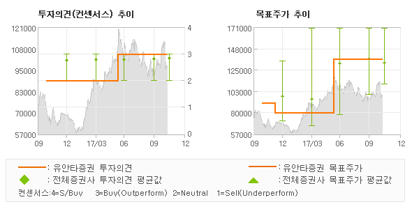 오늘 유안타증권에서 발표된 '매수(유지)'의견 및 목표주가 137,000원은 전체 컨센서스 대비해서 대체적으로 평균치에 해당하는 수준으로, 이번 의견은 동종목에 대한 전체적인 흐름에서 크게 벗어나지 않은 것으로 파악되며 목표가평균과 대비해서 미미한 차이가 나는 것으로 집계되었다. 참고로 최근에 목표주가를 가장 공격적으로 제시한 하나금융투자에서 투자의견 '매수'에 목표주가 170,000원을 제일 보수적인 의견을 제시한 하이투자증권에서 투자의견 'HOLD(MAINTAIN)'에 목표주가 110,000원을 제시한 바 있다.