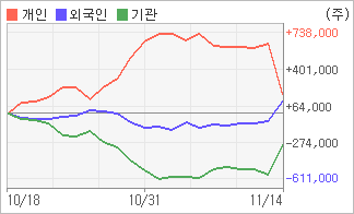 | 외국인/개인 순매수, 기관은 순매도(한달누적) 11월9일부터 전일까지 외국인이 4거래일 연속 순매수를 보였다. 4주간을 기준으로 보면 외국인이 매매관점을 매도에서 매수로 전환하면서 111,481주를 순매수했고, 개인들도 매기를 떨어뜨리면서도 178,831주를 순매수했다. 하지만 기관은 매도 우위를 보이면서 290,312주를 순매도했다. |