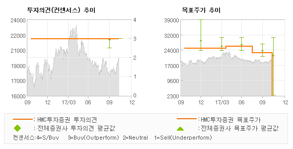 HMC투자증권의 동종목에 대한 최근 1년동안의 투자의견은 전체적으로 큰 변화없이 유지되고 있다. 목표주가는 2017년4월 26,000원까지 높아졌다가 2017년8월 23,000원을 최저점으로 목표가가 제시된 이후 최근에 2,300원으로 새롭게 조정되고 있다.