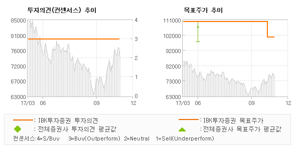 오늘 IBK투자증권에서 발표된 '매수(유지)'의견 및 목표주가 100,000원은 전체의견에 수렴하면서 시장의 평균적인 기대감이 비교적 객관적으로 표현된 것으로 풀이되며 목표가평균 대비 5.4% 초과하고 있는 것으로 집계되었다. 참고로 최근에 목표주가를 가장 공격적으로 제시한 KTB투자증권에서 투자의견 '매수'에 목표주가 100,000원을 제일 보수적인 의견을 제시한 HMC투자증권에서 투자의견 '매수'에 목표주가 83,000원을 제시한 바 있다.