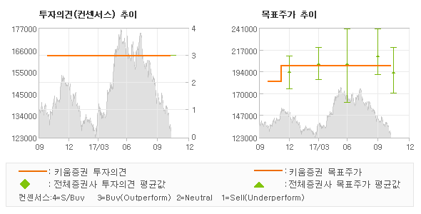 키움증권의 동종목에 대한 최근 1년동안의 투자의견은 전체적으로 큰 변화없이 유지되고 있다. 목표주가는 2016년10월 183,000원이 저점으로 제시된 이후 이번에 발표된 200,000원까지 꾸준하게 상향조정되어 왔다.