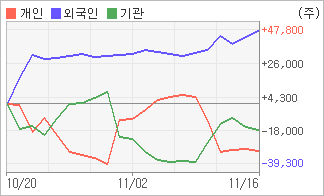| 기관과 개인은 순매도, 외국인은 순매수(한달누적) 기관이 2일연속 주식을 팔고 있는 반면 외국인은 2일연속 주식을 사고 있다. 4주간을 기준으로 보면 외국인이 초반에 동종목을 순매수한 이후에 기세를 이어가며 47,710주를 순매수한 반면, 기관은 매도 우위를 보이면서 16,964주를 순매도했고, 개인들도 매도쪽으로 방향을 잡으면서 30,746주를 순매도한 것으로 집계됐다. |