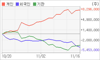 | 외국인과 기관은 순매도, 개인은 순매수(한달누적) 기관이 3일연속 순매수를 보이고 있는 반면에 외국인은 2일연속 순매도를 보이고 있다. 4주간을 기준으로 보면 외국인이 매도 우위를 지속하면서 4,325,160주를 순매도했고, 기관도 매도 관점으로 접근하면서 3,751,408주를 순매도했지만, 개인은 오히려 순매수량을 늘리며 8,076,568주를 순매수했다. |