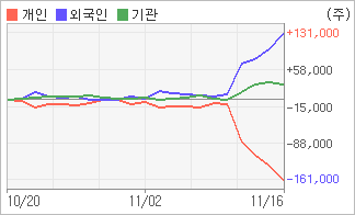 | 외국인/기관 순매수, 개인은 순매도(한달누적) 11월10일부터 전일까지 외국인이 5거래일 연속 동종목을 사들였다. 4주간을 기준으로 보면 외국인이 초반에 동종목을 순매수한 이후에 기세를 이어가며 130,238주를 순매수했고, 기관도 방향성있는 매매를 하면서 29,920주를 순매수했다. 반면 개인들은 매도쪽으로 방향을 잡으면서 160,158주를 순매도한 것으로 나타났다. |