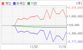 | 외국인과 기관은 순매도, 개인은 순매수(한달누적) 전일 외국인이 1,340,221주를 순매수했다. 4주간을 기준으로 보면 외국인이 매도 후 매수의 관점을 보이고 있음에도 불구하고 1,082,135주를 순매도했고, 기관도 매도 관점으로 접근하면서 259,620주를 순매도했지만, 개인은 오히려 매기를 떨어뜨리면서도 1,341,755주를 순매수했다. |