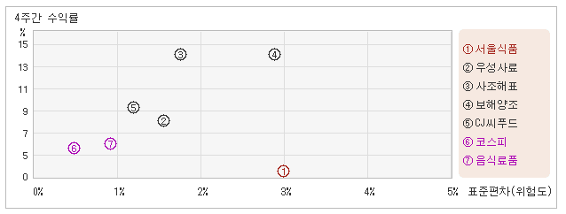 | 관련종목들 가운데 변동폭 작아도 수익율은 높아 17일 오전 11시5분 현재 전일대비 1.32% 하락하면서 299원을 기록하고 있는 서울식품은 같은 기간동안 변동성의 크기를 말해주는 표준편차는 3%를 기록했다. 이는 음식료품 업종내에서 주요종목들과 비교해볼 때 다만 음식료품업종의 위험대비수익률인 4.1보다는 낮기 때문에 업종대비 성과가 좋았다고는 할 수 없다. 다음으로 업종과 시장을 비교해보면 서울식품이 속해 있는 음식료품업종은 코스피지수보다 변동성과 수익률이 모두 높은 모습이다. 다시 말하면 동업종에 탄력이 붙으면서 지수대비 초과상승했다는 의미이다. |