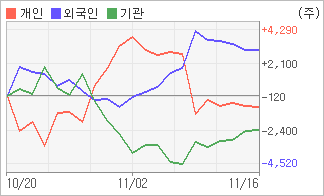 | 기관과 개인은 순매도, 외국인은 순매수(한달누적) 기관이 4일연속 순매수를 보이고 있는 반면에 외국인은 5일연속 순매도를 보이고 있다. 4주간을 기준으로 보면 외국인이 초반에 동종목을 순매수한 이후에 기세를 이어가며 2,994주를 순매수한 반면, 기관은 매도 우위를 보이면서 2,247주를 순매도했고, 개인들도 매도 우위로 반전되면서 747주를 순매도한 것으로 집계됐다. |