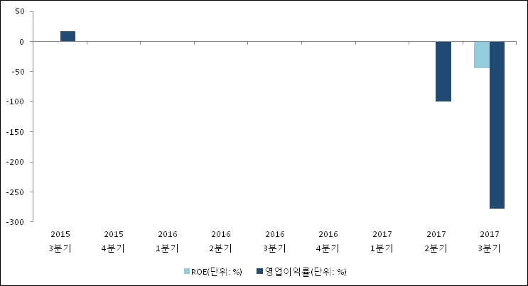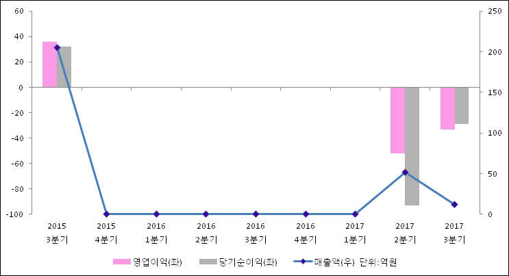 11월 17일 이에스브이(223310)의 2017년 3분기 연결 확정 실적이 발표됐다. 매출액은 전년 같은 기간 대비해서 82.34% 감소하여 12억원라고 발표됐다. 영업이익은 -33.4억원으로 -8.6억원에서 적자폭이 확대되었다. 당기순이익은 -29.1억원으로 -7.5억원에서 적자확대되었다.