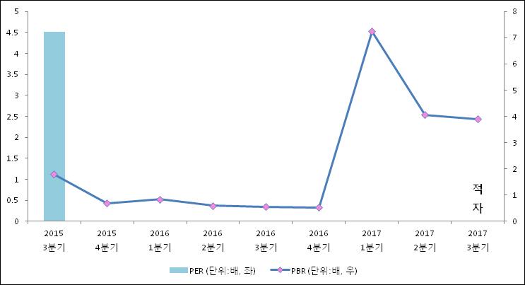 주가가 1주당 순자산의 몇배인지 알려주는 주가순자산비율인 PBR은 3.89배이다. 지난해 동기 PBR은 0.56배로 이번 3분기 PBR이 상승했다.
