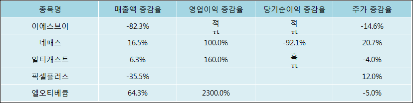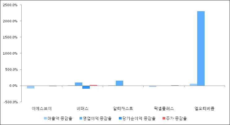다음은 이에스브이와 동일 업종 내 비교 그룹 종목의 각각 최근 실적의 전년 동기 대비 성장률이다. 이에스브이의 매출액 증감율은 타 종목 대비 가장 저조한 편이다. 그리고 주가의 하락율이 가장 큰 편으로 나타났다.