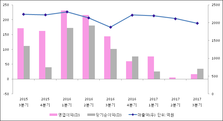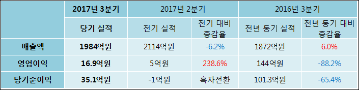 11월 17일 동성코퍼레이션(102260)의 2017년 3분기 연결 확정 실적이 발표됐다. 매출액은 작년 같은 기간 대비해서 5.97% 신장된 1984억원으로 발표되었다. 매출액 상승에도 불구하고영업이익은 88.24% 감소하여 16.9억원으로, 당기순이익은 65.39% 줄어들어 35.1억원으로 기록 되었다.