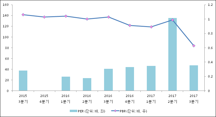 주가가 1주당 수익의 몇배가 되는지 나타내는 주가수익비율(PER)은 47.4배로 나타났다. PER은 최근 4분기 이상 꾸준히 상승하다가 이번 분기에 하락했다. 전년 동기 PER은 40.72배로 이번 분기에 상승했다.주가가 1주당 순자산의 몇배인지 알려주는 주가순자산비율인 PBR은 0.63배이다. 지난해 동기 PBR은 1.03배로 이번 3분기 PBR이 하락했다.