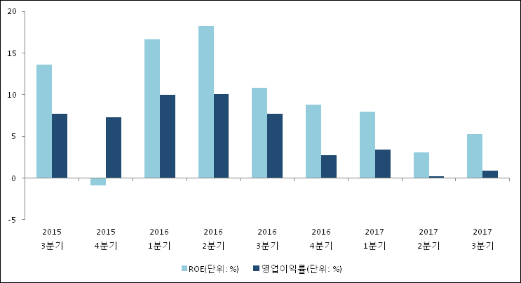 이번분기 기준으로 추정되는 동성코퍼레이션의 자기자본이익률(ROE)은 5.3%로 나타났다. ROE는 최근 4분기 이상 연속으로 하락하다 이번 분기에 상승했다. 전년 동기인 2016년 3분기 ROE는 10.8%로 이번 분기에 5.5%p 하락했다. 한편 동종목의영업이익률은 0.9%이다. 지난해 동기 영업이익률은 7.7%로 이번 3분기에 6.8%p 하락했다.