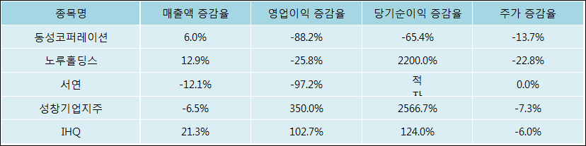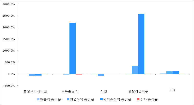 다음은 동성코퍼레이션과 동일 업종 내 비교 그룹 종목의 각각 최근 실적의 전년 동기 대비 성장률이다. 동성코퍼레이션의 매출액 증감율은 타 종목 대비 양호한 편이다. 그리고 주가의 하락율이 비교적 큰 편으로 나타났다.