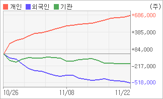 | 외국인과 기관은 순매도, 개인은 순매수(한달누적) 11월17일부터 전일까지 외국인이 4거래일 연속 순매도했다. 4주간을 기준으로 보면 외국인이 매도 우위를 지속하면서 517,207주를 순매도했고, 기관도 매도 관점으로 접근하면서 168,722주를 순매도했지만, 개인은 오히려 순매수량을 늘리며 685,929주를 순매수했다. |