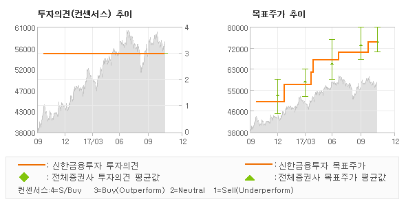 오늘 신한금융투자에서 발표된 '매수(유지)'의견 및 목표주가 74,000원은 전체 컨센서스 대비해서 대체적으로 평균치에 해당하는 수준으로, 이번 의견은 동종목에 대한 전체적인 흐름에서 크게 벗어나지 않은 것으로 파악되며 목표가평균과 대비해서 미미한 차이가 나는 것으로 집계되었다. 참고로 최근에 목표주가를 가장 공격적으로 제시한 DB금융투자에서 투자의견 '매수(유지)'에 목표주가 79,800원을 제일 보수적인 의견을 제시한 유안타증권에서 투자의견 '매수(유지)'에 목표주가 70,000원을 제시한 바 있다.