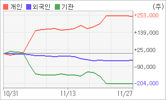 | 외국인과 기관은 순매도, 개인은 순매수(한달누적) 11월22일부터 전일까지 외국인이 4거래일 연속 순매수를 보였다. 4주간을 기준으로 보면 외국인이 매도 우위를 지속하면서 46,614주를 순매도했고, 기관도 매도 관점으로 접근하면서 202,319주를 순매도했지만, 개인은 오히려 순매수량을 늘리며 248,933주를 순매수했다. |