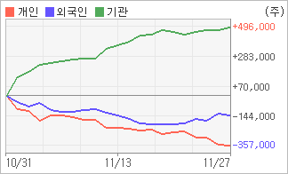 | 외국인과 개인은 순매도, 기관은 순매수(한달누적) 전일 기관이 23,725주를 순매수했고, 외국인은 14,738주를 순매도했다. 4주간을 기준으로 보면 기관이 방향성있는 매매를 하면서 495,912주를 순매수한 반면, 외국인은 매도 후 매수의 관점을 보이고 있음에도 불구하고 139,805주를 순매도했고, 개인들도 매도쪽으로 방향을 잡으면서 356,107주를 순매도했다. |