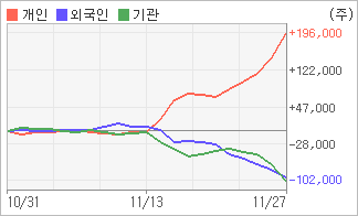| 외국인과 기관은 순매도, 개인은 순매수(한달누적) 전일까지 외국인이 7일 연속, 기관이 4일 연속 각각 동종목을 순매도 했다. 4주간을 기준으로 보면 외국인이 순매도로 돌아서면서 94,285주를 순매도했고, 기관도 매도 관점으로 접근하면서 101,220주를 순매도했지만, 개인은 오히려 순매수량을 늘리며 195,505주를 순매수했다. |