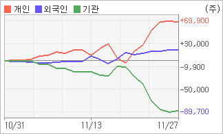 | 외국인/개인 순매수, 기관은 순매도(한달누적) 전일 기관이 2,469주를 순매수했고, 외국인은 879주를 순매도했다. 4주간을 기준으로 보면 외국인이 초반에 동종목을 순매수한 이후에 기세를 이어가며 18,894주를 순매수했고, 개인들도 순매수량을 늘리며 68,238주를 순매수했다. 하지만 기관은 매도 관점으로 접근하면서 87,132주를 순매도했다. |