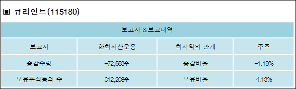 큐리언트(115180)는 08일 주주 한화자산운용을 비롯한 특별관계자의 보유주식이 감소되었다고 발표했다. 이는 직전 보고일보다 72,553주 감소하여 지분율은 4.13%로 하락했다. 이번 보고 사유는 단순추가취득/처분,실물출고,펀드이관으로 알려졌다.