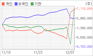 | 외국인/개인 순매수, 기관은 순매도(한달누적) 12월6일부터 전일까지 기관과 외국인은 2거래일연속 동반 순매도했다. 4주간을 기준으로 보면 외국인이 매수 우위를 유지하면서 2,819,363주를 순매수했고, 개인들도 매수반전의 모습을 보이며 6,882,710주를 순매수했다. 하지만 기관은 매도 관점으로 접근하면서 9,702,073주를 순매도했다. |