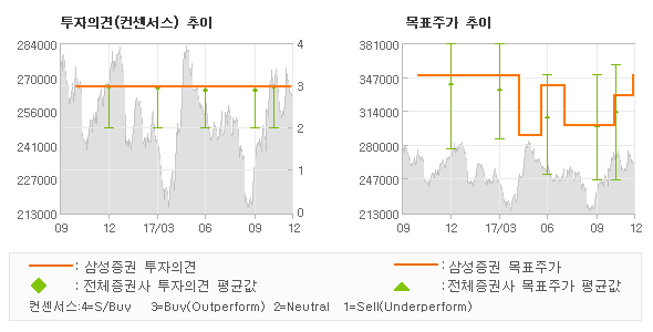 삼성증권의 동종목에 대한 최근 1년동안의 투자의견은 전체적으로 큰 변화없이 유지되고 있다. 목표주가는 한때 2017년5월 290,000원을 저점으로 기록된 이후 최근에 350,000원까지 다시 상향조정되고 있다.