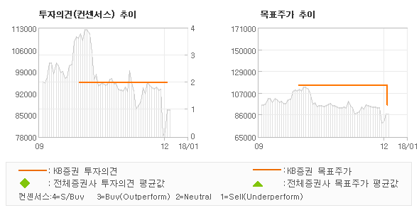 KB증권의 동종목에 대한 최근 6개월 동안의 투자의견은 전체적으로 큰 변화없이 유지되고 있다. 목표주가는 2017년2월 65,000원까지 내려갔다가 2017년11월 115,000원을 최고점으로 목표가가 제시된 이후 최근에 95,000원으로 한단계 하향조정되고 있다.