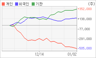 | 외국인/기관 순매수, 개인은 순매도(한달누적) 12월28일부터 전일까지 외국인이 2거래일 연속 순매수를 보였다. 4주간을 기준으로 보면 외국인이 매수 우위를 유지하면서 153,807주를 순매수했고, 기관도 방향성있는 매매를 하면서 351,068주를 순매수했다. 반면 개인들은 매도쪽으로 방향을 잡으면서 504,875주를 순매도한 것으로 나타났다. |