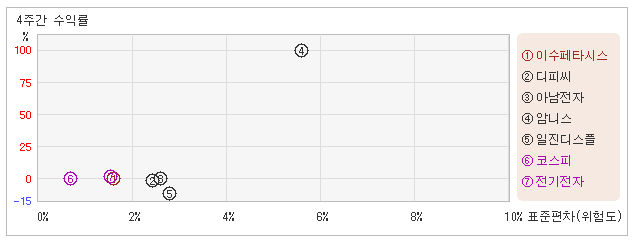 3일 오후 12시50분 현재 전일대비 1.89% 오른 4,305원을 기록하고 있는 이수페타시스는 지난 1개월간 0.46% 하락했다. 같은 기간동안 변동성의 크기를 말해주는 표준편차는 1.6%를 기록했다. 이는 전기전자 업종내에서 주요종목들과 비교해볼 때 이수페타시스의 월간 주가등락률이 마이너스에 머물고 있지만 변동성은 가장 낮은 수준을 유지했다는 뜻이다. 최근 1개월을 기준으로 이수페타시스의 위험을 고려한 수익률은 -0.2를 기록했는데, 주가는 하락했지만 변동성이 낮아서 위험대비 수익률은 주요종목군 내에서 적정수준을 유지했다. 다만 전기전자업종의 위험대비수익률 1.2보다는 낮았기 때문에 업종대비 성과는 긍정적으로 보기 어렵다. 다음으로 업종과 시장을 비교해보면 이수페타시스가 속해 있는 전기전자업종은 코스피지수보다 변동성과 수익률이 모두 높은 모습이다. 다시 말하면 동업종에 탄력이 붙으면서 지수대비 초과상승했다는 의미이다.