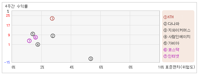 | 관련종목들 가운데서 위험도는 낮고 성과는 좋아 3일 오후 1시50분 현재 전일대비 4.79% 오른 7,000원을 기록하고 있는 KTH는 지난 1개월간 22.81% 상승했다. 같은 기간동안에 위험를 나타내는 지표인 표준편차는 2.7%를 기록했다. 이는 인터넷 업종내에서 주요종목들과 비교해볼 때 KTH의 월간 주가수익률이 가장 높았던 만큼 변동성도 상당히 높은 수준을 유지했다는 뜻이다. 최근 1개월을 기준으로 KTH의 위험을 고려한 수익률은 8.4를 기록했는데, 변동성은 높았으나 주가수익률이 양호했기 때문에 위험대비 수익률도 높은 수준을 나타냈다. 뿐만아니라 인터넷업종의 위험대비수익률인 2.9보다도 높기 때문에 업종대비 성과도 좋았다고 할 수 있다. 다음으로 업종과 시장을 비교해보면 KTH가 속해 있는 인터넷업종은 코스닥지수보다 변동성과 수익률이 모두 낮은 모습을 보여주고 있다. 다시 말해서 동업종의 탄력이 떨어지면서 업종상승률도 미진했다는 의미이다. |