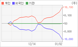 | 외국인과 기관은 순매도, 개인은 순매수(한달누적) 기관이 2일연속 순매수를 보이고 있는 반면에 외국인은 8일연속 순매도를 보이고 있다. 4주간을 기준으로 보면 외국인이 매도 우위를 지속하면서 15,929주를 순매도했고, 기관도 순매수에서 순매도로 반전되면서 101주를 순매도했지만, 개인은 오히려 순매수량을 늘리며 16,030주를 순매수했다. |