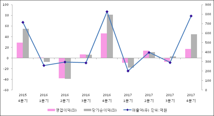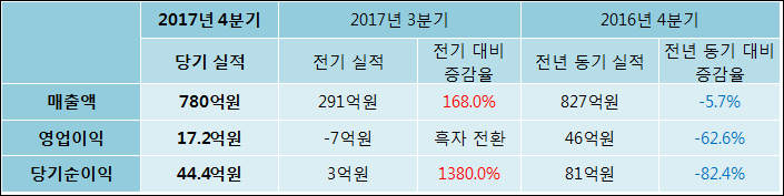 01월 04일 콤텍시스템(031820)의 2017년 4분기 연결 확정 실적이 발표됐다. 지난해 같은 기간 대비해서 매출액, 영업이익, 당기순이익 모두 감소하였다. 매출액은 5.7% 감소한 780억원을, 영업이익은 62.6% 감소하여 17.2억원으로 발표됐다. 당기순이익은 82.4% 줄어들어 44.4억원으로 집계되었다.