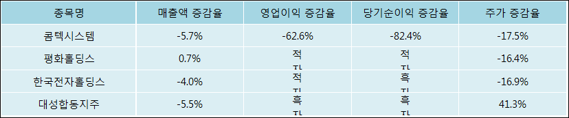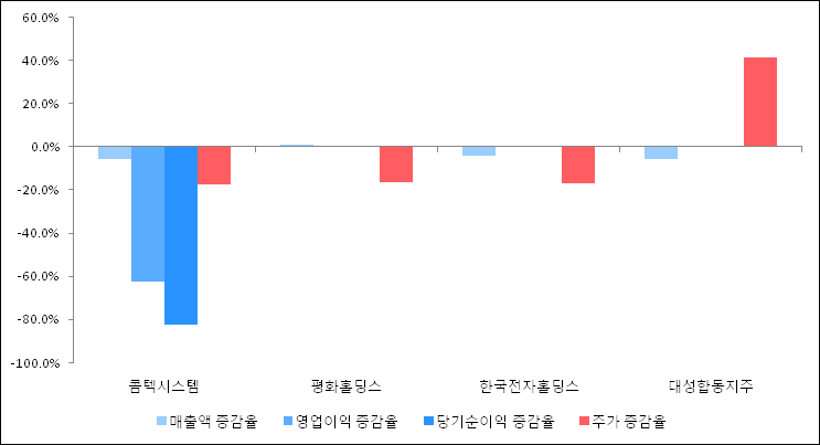 다음은 콤텍시스템과 동일 업종 내 비교 그룹 종목의 각각 최근 실적의 전년 동기 대비 성장률이다. 콤텍시스템의 매출액 증감율은 타 종목 대비 가장 저조한 편이다. 그리고 주가의 하락율이 가장 큰 편으로 나타났다.