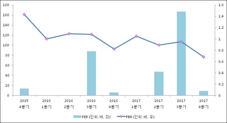 주가가 1주당 수익의 몇배가 되는지 나타내는 주가수익비율(PER)은 8.8배로 나타났다. 전년 동기 PER은 5.77배로 이번 분기에 상승했다.주가가 1주당 순자산의 몇배인지 알려주는 주가순자산비율인 PBR은 0.68배이다. 지난해 동기 PBR은 0.82배로 이번 4분기 PBR이 하락했다.