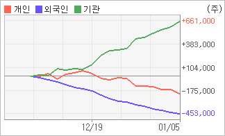 | 외국인과 개인은 순매도, 기관은 순매수(한달누적) 기관이 11일연속 순매수를 보이고 있는 반면에 외국인은 27일연속 순매도를 보이고 있다. 4주간을 기준으로 보면 기관이 방향성있는 매매를 하면서 660,347주를 순매수한 반면, 외국인은 매도 우위를 지속하면서 452,083주를 순매도했고, 개인들도 매도쪽으로 방향을 잡으면서 208,264주를 순매도했다. |