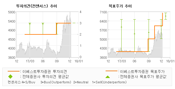 오늘 이베스트투자증권에서 발표된 '매수(유지)'의견 및 목표주가 7,000원은 전체의견에 수렴하면서 시장의 평균적인 기대감이 비교적 객관적으로 표현된 것으로 풀이되며 목표가평균 대비 11.7% 초과하고 있는 것으로 집계되었다. 참고로 최근 증권사 매매의견 중에서 제일 보수적인 의견을 제시한 신한금융투자에서 투자의견 '매수(유지)'에 목표주가 5,700원을 제시한 바 있다.