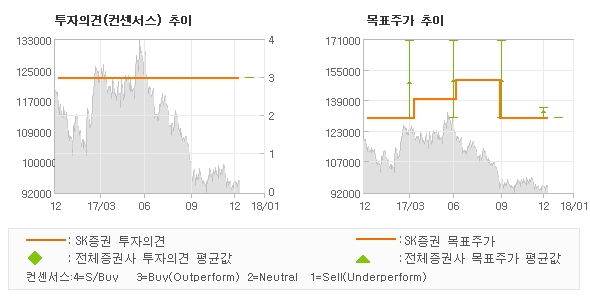 SK증권의 동종목에 대한 최근 1년동안의 투자의견은 전체적으로 큰 변화없이 유지되고 있다. 목표주가는 한때 2017년7월 150,000원을 최고점으로 기록된 이후 최근에 130,000원 수준까지 다소 하향조정되고 있다.