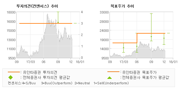 유안타증권의 동종목에 대한 최근 1년동안의 투자의견은 전체적으로 큰 변화없이 유지되고 있다. 목표주가는 2017년1월 17,000원이 저점으로 제시된 이후 이번에 발표된 22,000원까지 꾸준하게 상향조정되어 왔다.