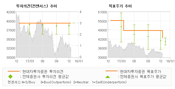 현대차투자증권의 동종목에 대한 최근 1년동안의 투자의견은 전체적으로 큰 변화없이 유지되고 있다. 목표주가는 2017년1월 55,000원까지 높아졌다가 2017년4월 48,000원을 최저점으로 목표가가 제시된 이후 최근에 43,000원으로 새롭게 조정되고 있다.