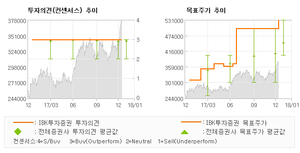 오늘 IBK투자증권에서 발표된 '매수(유지)'의견 및 목표주가 530,000원은 전체 컨센서스 대비해서 대체적으로 평균치에 해당하는 수준으로, 이번 의견은 동종목에 대한 전체적인 흐름에서 크게 벗어나지 않은 것으로 파악되며 목표가평균 대비 25% 초과하고 있는 것으로 집계되었다. 참고로 최근 증권사 매매의견 중에서 제일 보수적인 의견을 제시한 하나금융투자에서 투자의견 'NEUTRAL'에 목표주가 300,000원을 제시한 바 있다.